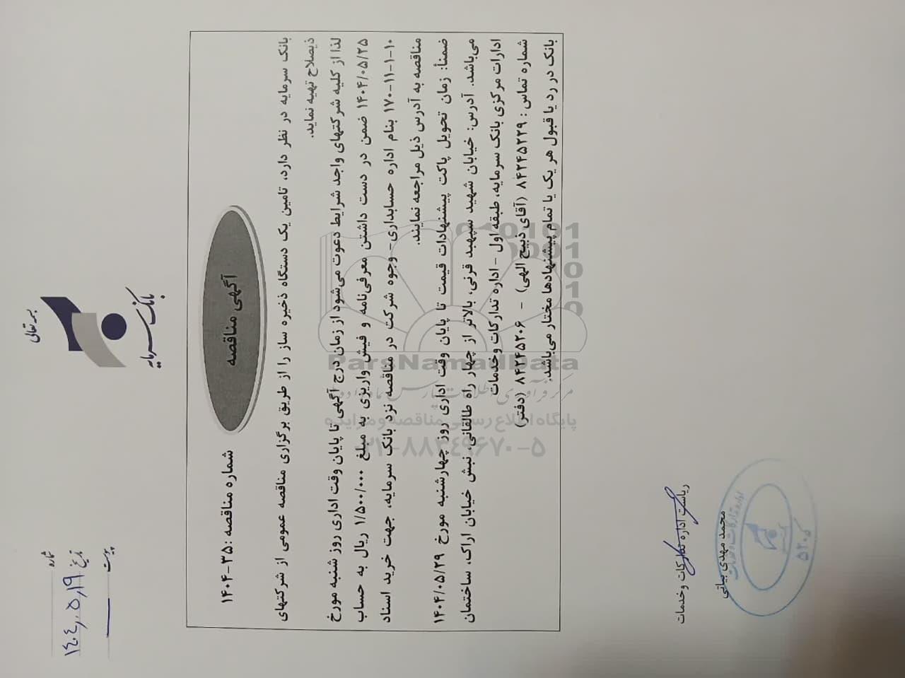 بانک سرمایه در نظر دارد، تامین یک دستگاه ذخیره ساز را از طریق برگزاری مناقصه عمومی از شرکتهای ذیصلاح تهیه نماید.