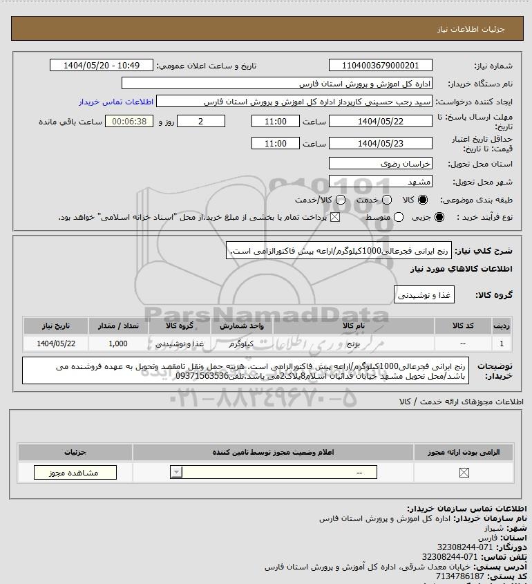 شرح کلی نیاز: رنج ایرانی فجرعالی1000کیلوگرم/اراعه پیش فاکتورالزامی است.