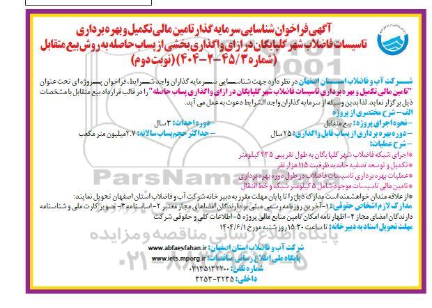 آگهی فراخوان شناسایی سرمایه گذار تامین مالی تکمیل و بهره برداری تاسیسات فاضلاب شهر گلپایگان در ازای واگذاری بخشی از پساب حاصله به روش بیع متقابل (شماره 45/3 - 2 - 404) (نوبت دوم)