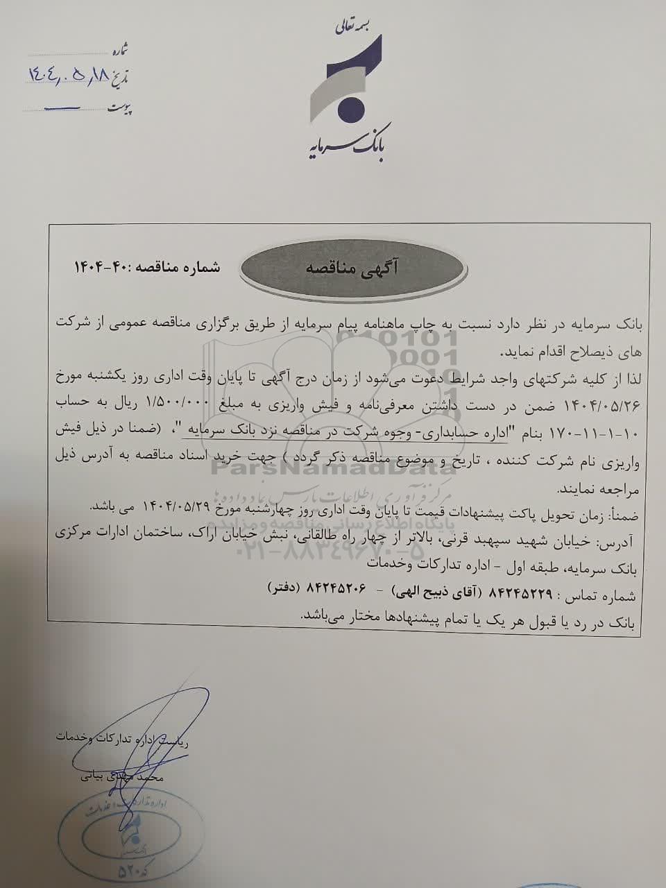 برای شرکت در مناقصه حتما از تصویر آگهی در سایت پارس نماد داده ها استفاده نمایید