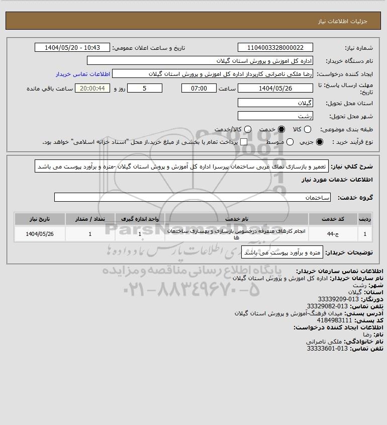 شرح کلی نیاز: تعمیر و بازسازی نمای غربی ساختمان پیرسرا اداره کل آموزش و پروش استان گیلان -متره و برآورد پیوست می باشد