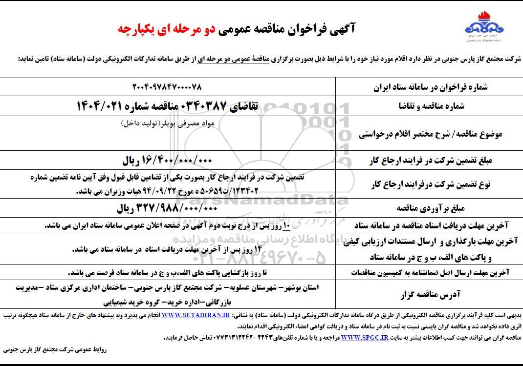 مناقصه مواد مصرفی بویلر (تولید داخل) از کلیه افراد متخصص و شرکتها واجد شرایط دعوت به عمل میآید در مناقصه با کد خبرگزاری پارس نماد: 9392856 شرکت نمایند.