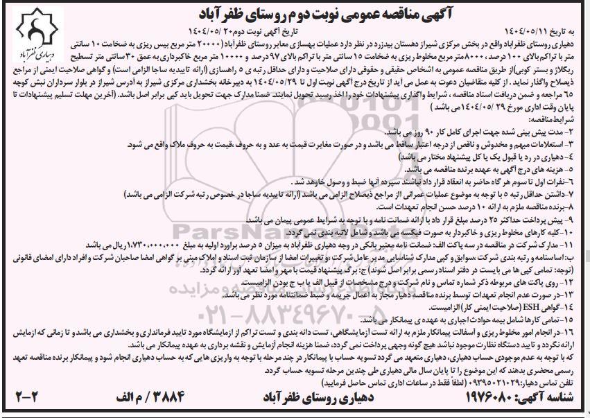 دهیاری روستای ظفرآباد واقع در بخش مرکزی شیراز دهستان بیدزرد در نظر دارد عملیات بهسازی معابر روستای ظفرآباد( 20000 متر مربع بیس ریزی به ضخامت 10 سانتی متر با تراکم بالای 100 درصد 8000 متر مربع مخلوط ریزی به ضخامت 15 سانتی متر با تراکم بالای 97 درصد و 10000 متر مربع خاکبرداری به عمق 30 سانتی متر تسطیح ریگلاژ و بستر کوبی ) از طریق مناقصه عمومی به اشخاص حقیقی و حقوقی دارای صلاحیت و دارای حداقل رتبه ی 5 راهسازی ارائه تاییدیه ساجا الزامی است) و گواهی صلاحیت ایمنی از مراجع ذیصلاح واگذار نماید. از کلیه متقاضیان دعوت بعمل میاید از تاریخ درج آگهی نوبت اول تا 1404.05.29 به دبیرخانه بخشداری مرکزی شیراز به آدرس شیراز در بلوار سرداران نبش کوچه 65 مراجعه و ضمن دریافت اسناد مناقصه شرایط واگذاری پیشنهادات خود را اخذ رسید تحویل نمایند. ضمنا مدارک جهت تحویل باید کپی برابر اصل باشد.