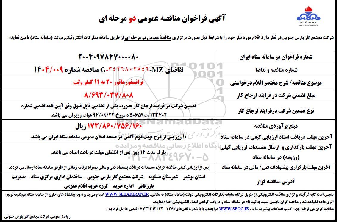 شرکت مجتمع گاز پارس جنوبی در نظر دارد اقلام مورد نیاز خود را با شرایط ذیل بصورت برگزاری مناقصه عمومی دو مرحله ای از طریق سامانه تدارکات الکترونیکی دولت سامانه ستاد تامین نماید.