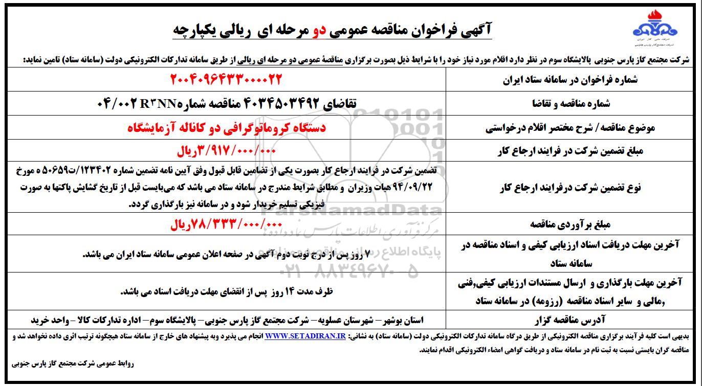 شرکت مجتمع گاز پارس جنوبی پالایشگاه سوم در نظر دارد اقلام مورد نیاز خود را با شرایط ذیل بصورت برگزاری مناقصه عمومی دو مرحله ای ریالی از طریق سامانه تدارکات الکترونیکی دولت (سامانه ستاد) تامین نماید: