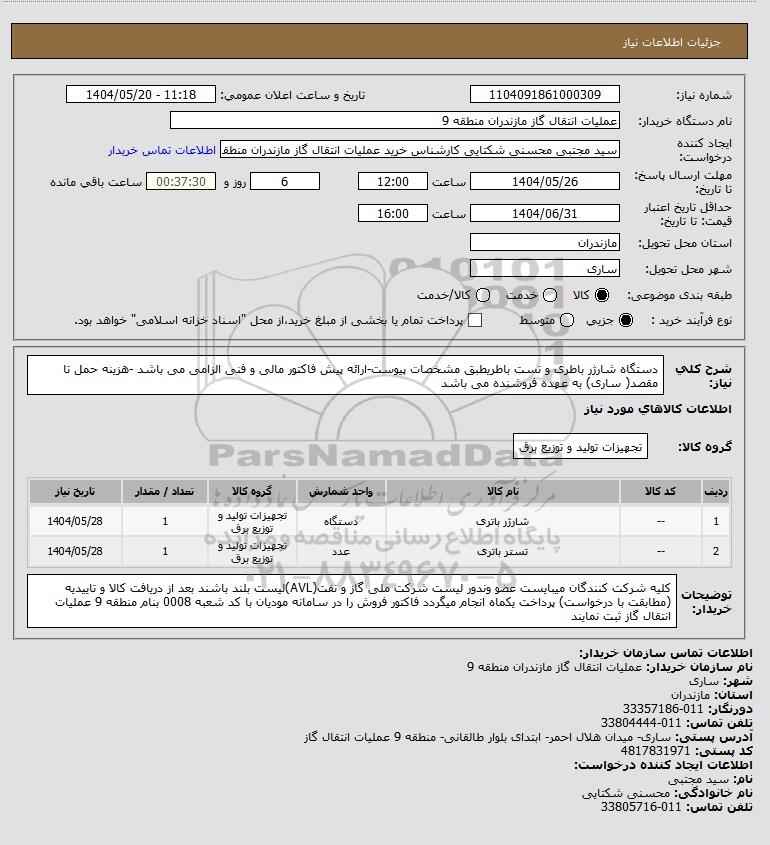 شرح کلی نیاز: دستگاه شارژر باطری و تست باطریطبق مشخصات پیوست-ارائه پیش فاکتور مالی و فنی الزامی می باشد -هزینه حمل تا مقصد( ساری) به عهده فروشنده می باشد