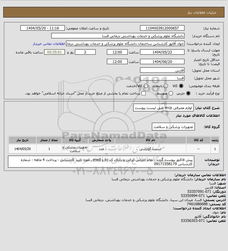شرح کلی نیاز: لوازم مصرفی ercp طبق لیست پیوست
