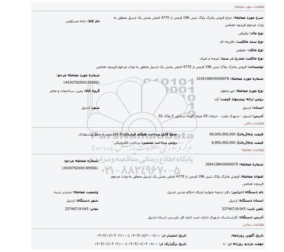 عنوان معامله: فروش ماترک پلاک ثبتی 196 فرعی از 4770 اصلی بخش یک اردبیل متعلق به وراث مرحوم فریدون تعنامی | ||