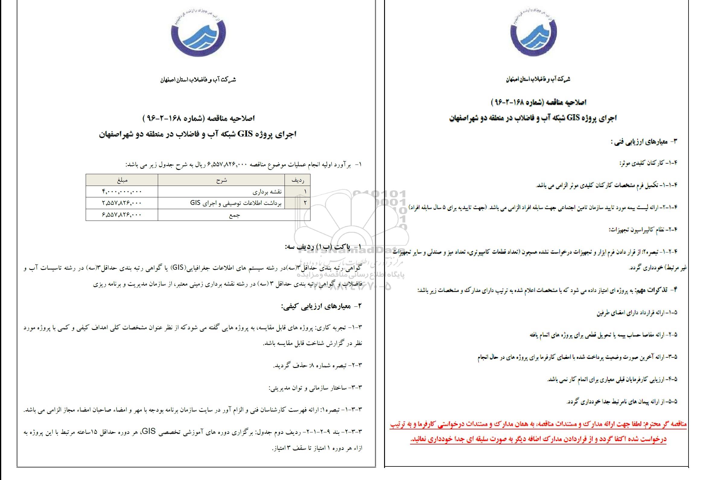 اصلاحیه مناقصه اجرای پروژه GIS شبکه آب و فاضلاب در منطقه دو ، شهر اصفهان , آگهی مناقصه عمومی , مناقصه اجرای پروژه GIS شبکه آب و فاضلاب در منطقه دو ، شهر اصفهان