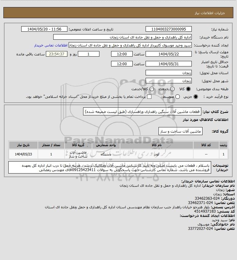 استعلام بها و موضوع استعلام استعلام قطعات ماشین آلات سنگین راهداری وراهسازی (طبق لیست ضمیمه شده) به اطلاع کلیه شرکت‌ها و افراد متخصص واجد شرایط می‌رساند، آگهی گذار در نظر دارد از طریق استعلام بها، نسبت به انتخاب و دریافت پیشنهادات اقدام نماید. این استعلام با کد آگهی ثبت شده در سامانه خبرگزاری پارس نماد : 9393762 منتشر شده است. مشخصات استعلام : تاریخ شروع استعلام: 1404/05/20 آخرین مهلت ارسال پیشنهاد قیمت : 1404/05/22 و محل اجرای پروژه : استان زنجان میباشد. استعلام قیمت مورد درخواست : استعلام قطعات ماشین آلات سنگین راهداری وراهسازی (طبق لیست ضمیمه شده) با دسته‌بندی‌های تخصصی و گروه های مرتبط : تامین،تعمیرات و اجاره خودروهای سنگین و نیمه سنگین, ماشین آلات راهسازی, قطعات خودرو, استعلام اطلاع رسانی میگردد.