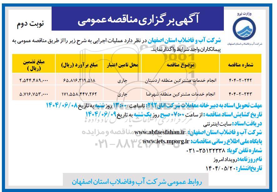 شرکت آب و فاضلاب استان اصفهان در نظر دارد عملیات اجرایی به شرح زیر را از طریق مناقصه عمومی به پیمانکاران واجد شرایط واگذار نماید.