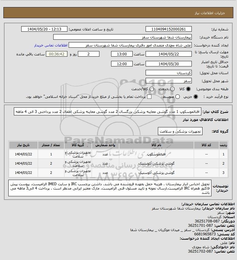 | 3 | -- | گوشی پزشکی آکوستیک | عدد | تجهیزات پزشکی و سلامت | 2 | 1404/05/22 |