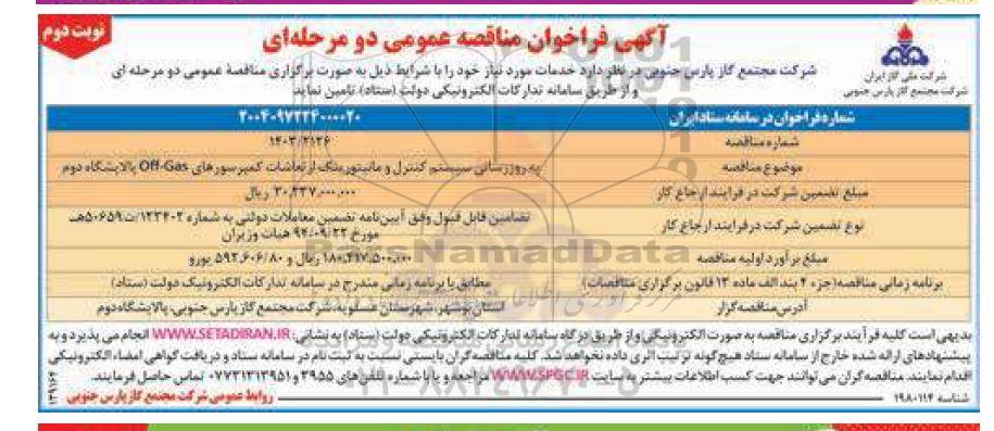 شرکت مجتمع گاز پارس جنوبی در نظر دارد خدمات مورد نیاز خود را با شرایط ذیل به صورت برگزاری مناقصه عمومی دو مرحله ای و از طریق سامانه تدارکات الکترونیکی دولت (ستاد) تامین نماید