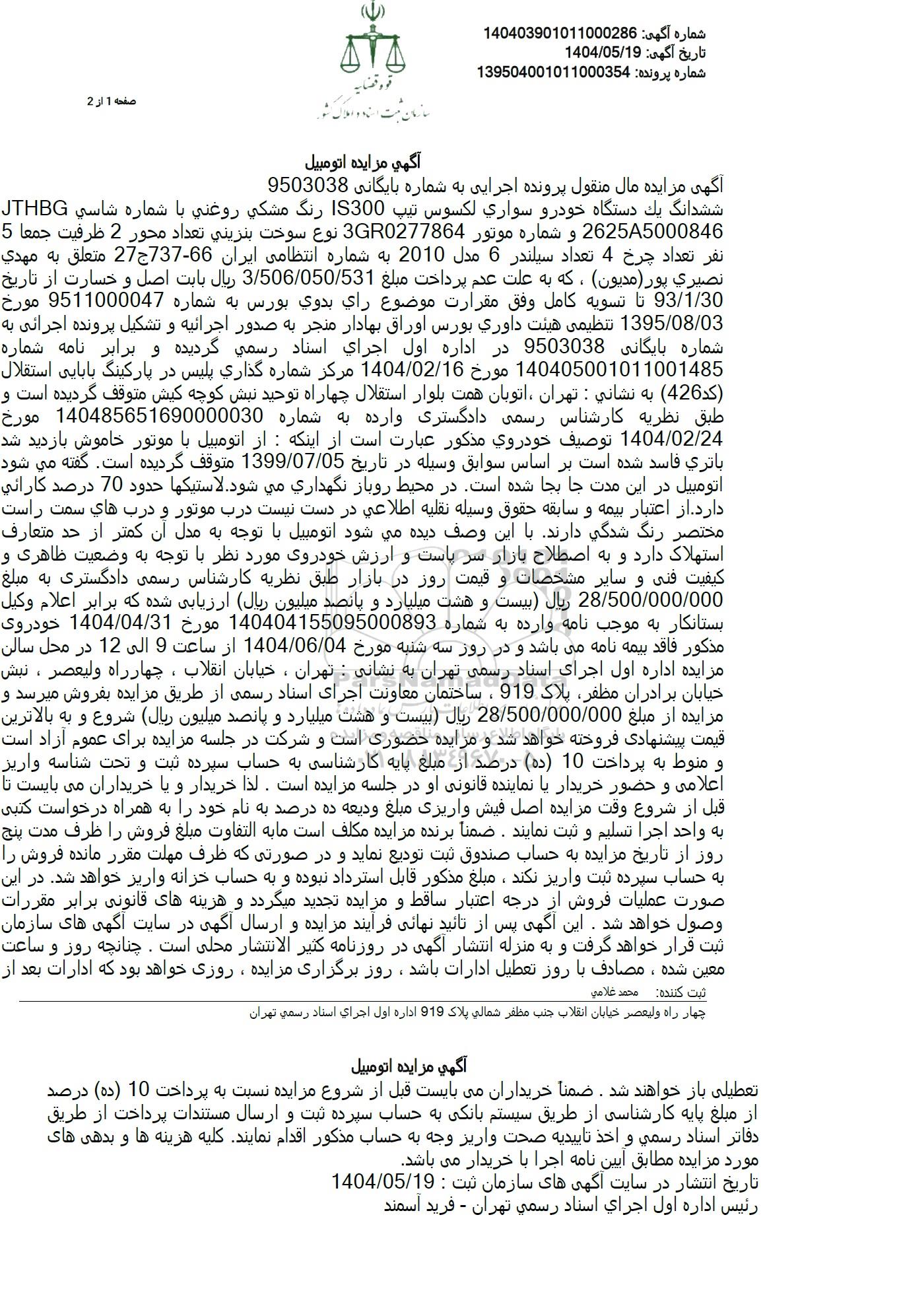 مزایده فروش یکدستگاه خودرو سواری لکسوس تیپ IS300 رنگ مشکی مدل 2010