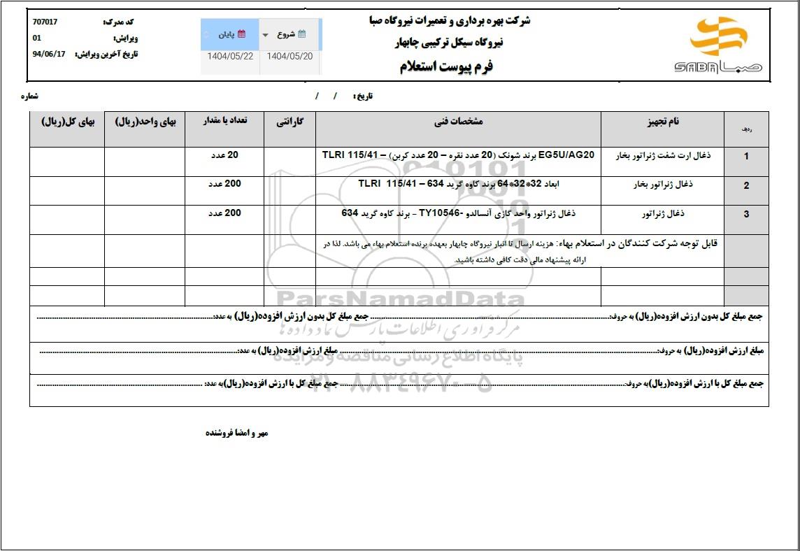 نحوه دریافت اسناد و ارسال پیشنهاد: متقاضیان میتوانند با ثبت نام در سامانه مناقصات و مزایدات ایران (پارس نماد) نسبت به مشاهده اسناد استعلام، دریافت اطلاعات تکمیلی، و ثبت پیشنهاد قیمت خود اقدام نمایند. در صورت نیاز به دریافت راهنمایی یا پشتیبانی در خصوص استعلام و مناقصه و فراخوان مناقصه عمومی، مناقصه محدود، مناقصه بین المللی، مناقصه دولتی، مناقصه خصوصی، مناقصه آنلاین فروش تجهیزات، مناقصه مشاورهای مناقصه پتروشیمی و انرژی مناقصه صنایع و تجهیزات برق و مخابرات و نفت و گاز ... لطفاً با سایت خبری مناقصه و مزایده پارسنماد دادهها به شماره 88349670 تماس حاصل فرمایید.