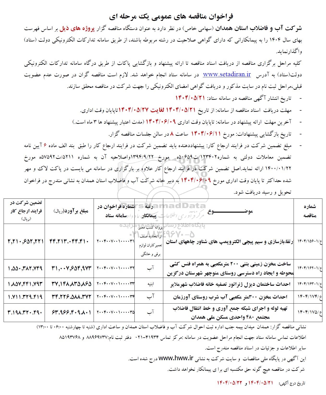 شرکت آب و فاضلاب استان همدان (سهامی خاص) در نظر دارد به عنوان دستگاه مناقصه گزار پروژههای ذیل بر اساس فهرست بهای سال 1404 را به پیمانکارانی که دارای گواهی صلاحیت در رشته مربوطه باشند از طریق سامانه تدارکات الکترونیکی دولت (ستاد) واگذار نماید.