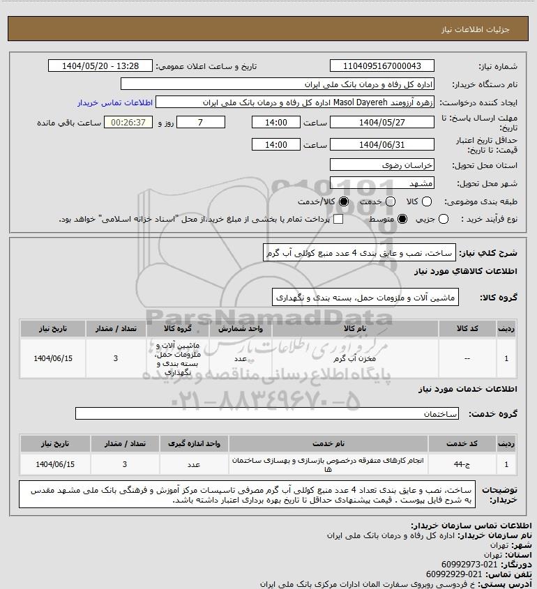 1 -- مخزن آب گرم عدد ماشین آلات و ملزومات حمل، بسته بندی و نگهداری 3 1404/06/15
