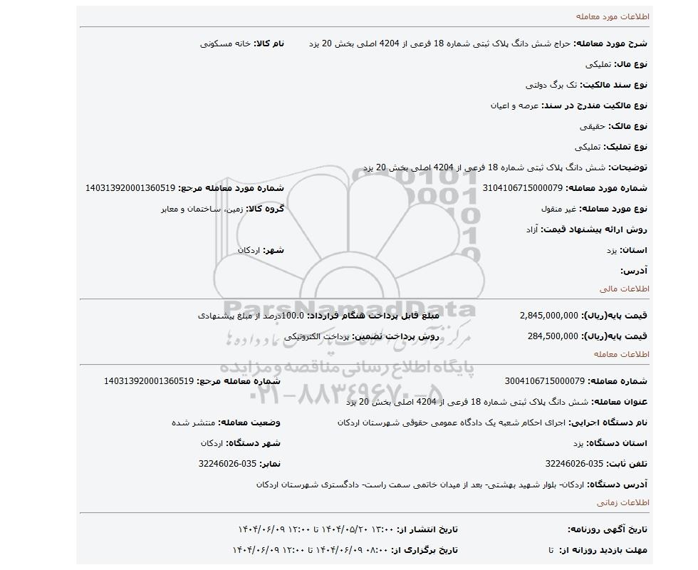 مزایده شش دانگ پلاک ثبتی شماره 18 فرعی از 4204 اصلی بخش 20 یزد, مزایده، شش دانگ پلاک ثبتی شماره 18 فرعی از 4204 اصلی بخش 20 یزد