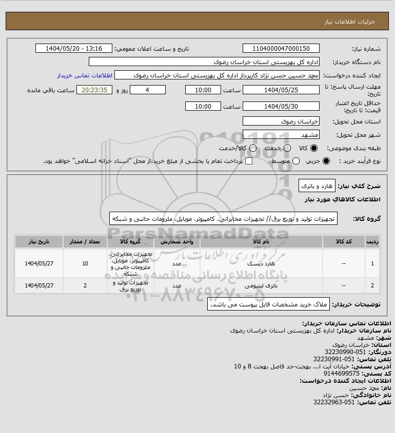 | 1 | -- | هارد دیسک | عدد | تجهیزات مخابراتی، کامپیوتر، موبایل، ملزومات جانبی و شبکه | 10 | 1404/05/27 |