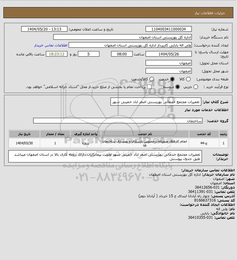 شرح کلی نیاز: تعمیرات مجتمع خدماتی بهزیستی اصغر اباد خمینی شهر