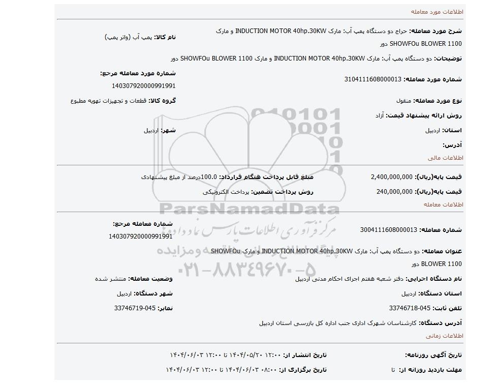عنوان معامله: دو دستگاه پمپ آب: مارک INDUCTION MOTOR 40hp.30KW و مارک SHOWFOu BLOWER 1100 دور | ||