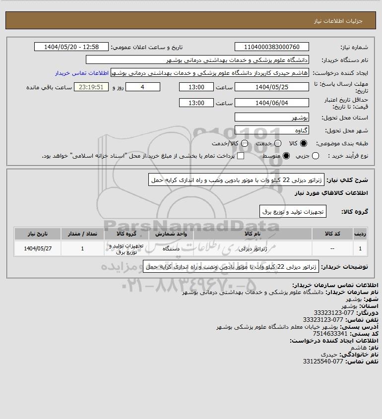 شرح کلی نیاز: ژنراتور دیزلی 22 کیلو وات با موتور بادوین ونصب و راه اندازی کرایه حمل