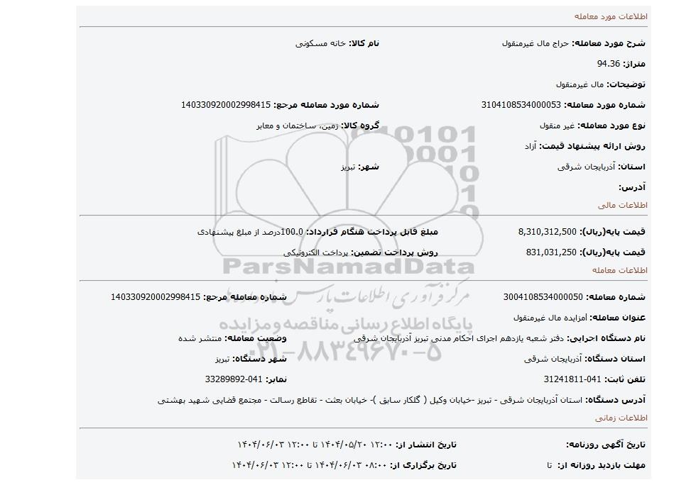 | شرح مورد معامله: حراج مال غیرمنقول | نام کالا: خانه مسکونی | |