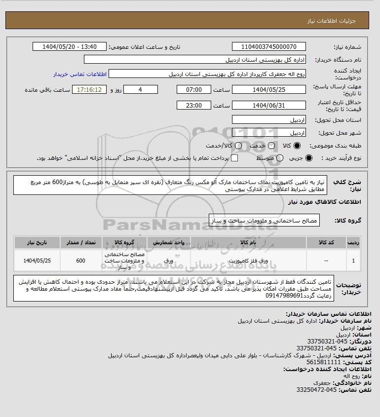 استعلام بها و موضوع استعلام استعلام نیاز به تامین کامپوزیت نمای ساختمان مارک آلو مکس رنگ متعارف (نقره ای سیر متمایل به طوسی) به متراژ600 متر مربع مطابق شرایط اعلامی در مدارک پیوستی به اطلاع کلیه شرکتها و افراد متخصص واجد شرایط میرساند، آگهی گذار در نظر دارد از طریق استعلام بها، نسبت به انتخاب و دریافت پیشنهادات اقدام نماید. این استعلام با کد آگهی ثبت شده در سامانه خبرگزاری پارس نماد : 9394517 منتشر شده است. مشخصات استعلام : تاریخ شروع استعلام: 1404/05/20 آخرین مهلت ارسال پیشنهاد قیمت : 1404/05/25 و محل اجرای پروژه : استان مناقصات استان اردبیل میباشد. استعلام قیمت مورد درخواست : استعلام نیاز به تامین کامپوزیت نمای ساختمان مارک آلو مکس رنگ متعارف (نقره ای سیر متمایل به طوسی) به متراژ600 متر مربع مطابق شرایط اعلامی در مدارک پیوستی با دستهبندیهای تخصصی و گروه های مرتبط : آهن آلات, انواع ورق, نمای ساختمان, قطعات فایبرگلاس, مصالح ساختمانی, استعلام اطلاع رسانی میگردد.