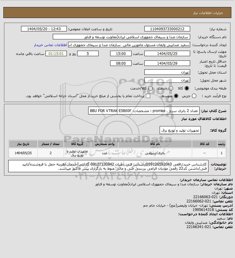 | 1 | -- | باتری لیتیومی | عدد | تجهیزات تولید و توزیع برق | 2 | 1404/05/25 |