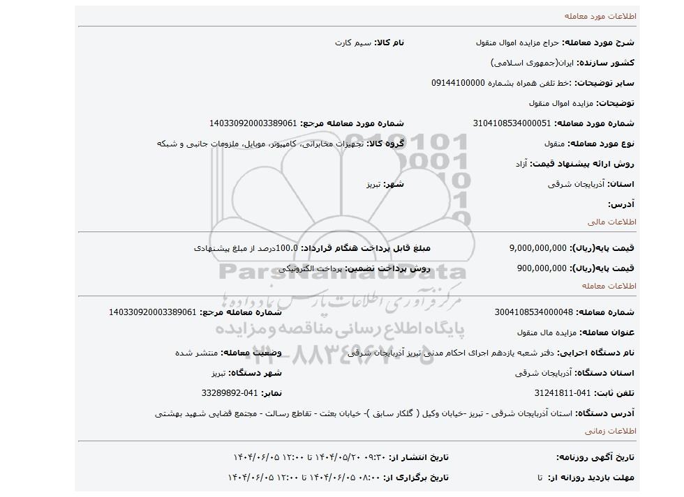 | شرح مورد معامله: حراج مزایده اموال منقول | نام کالا: سیم کارت | |