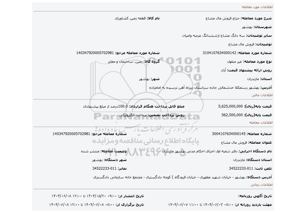 | شرح مورد معامله: حراج فروش مال مشاع | نام کالا: قطعه زمین کشاورزی | |