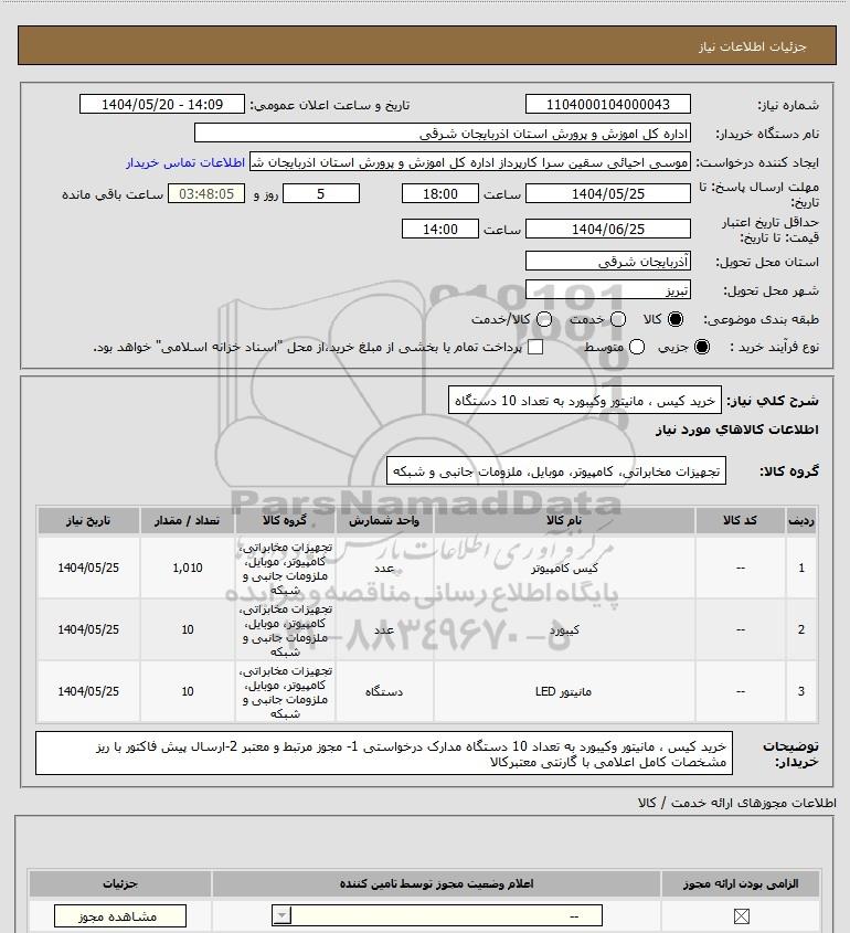 استعلام خرید کیس مانیتور وکیبورد به تعداد 10 دستگاه, استعلام خرید کیس ، مانیتور وکیبورد به تعداد 10 دستگاه