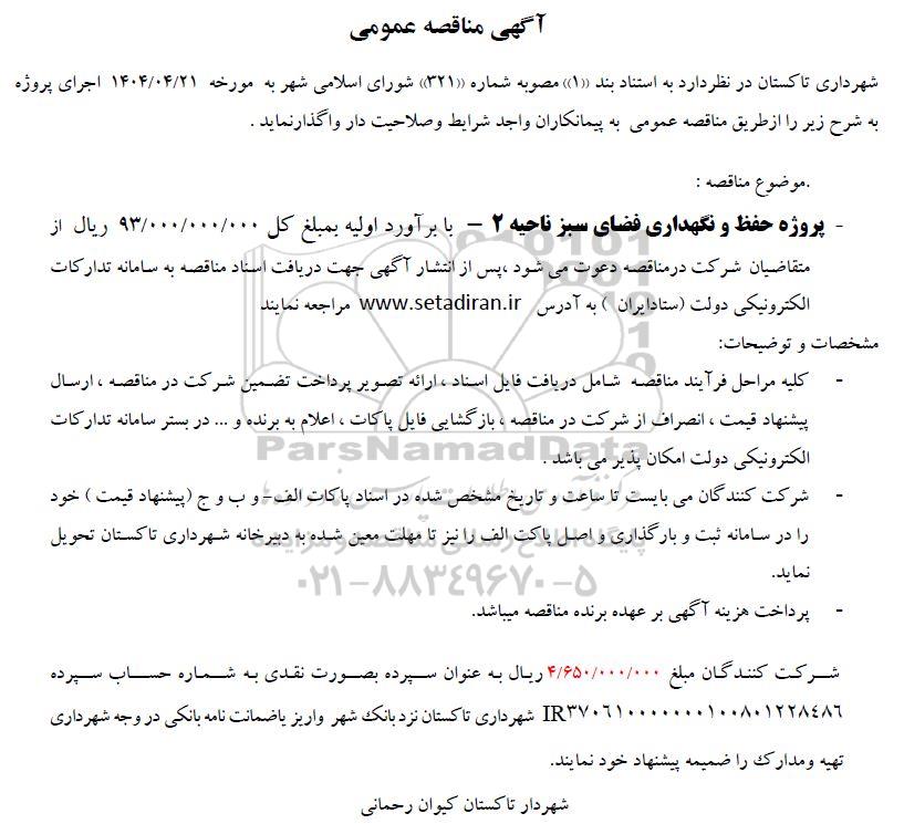 موضوع مناقصه: پروژه حفظ و نگهداری فضای سبز ناحیه 2 - با برآورد اولیه به مبلغ کل 93.000.000.000 ریال از متقاضیان شرکت در مناقصه دعوت می شود پس از انتشار آگهی جهت دریافت اسناد مناقصه به سامانه تدارکات الکترونیکی دولت ستاد ایران به آدرس ستاد ایران مراجعه نمایند.