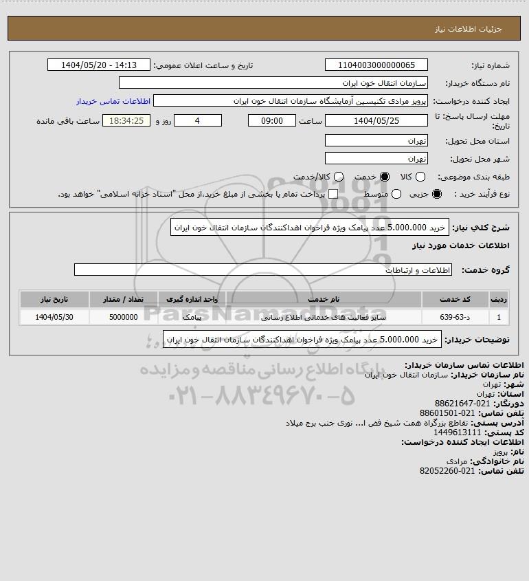 شرح کلی نیاز: خرید 5.000.000 عدد پیامک ویژه فراخوان اهداکنندگان سازمان انتقال خون ایران
