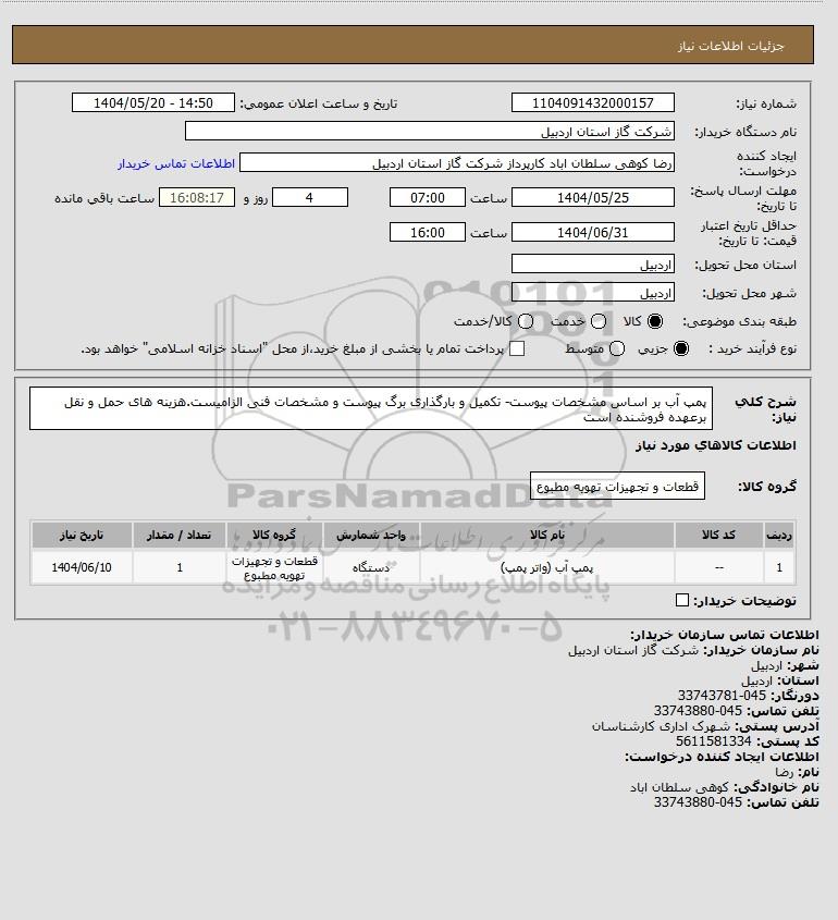 استعلام پمپ آب بر اساس مشخصات پیوست- تکمیل و بارگذاری برگ پیوست و مشخصات فنی الزامیست.هزینه های حمل و نقل برعهده فروشنده است, استعلام پمپ آب بر اساس مشخصات پیوست- تکمیل و بارگذاری برگ پیوست و مشخصات فنی الزامیست.هزینه های حمل و نقل برعهده فروشنده است