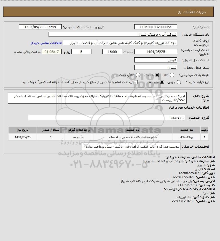 شرح کلی نیاز: اجرای حصارکشی، نصب سیستم هوشمند حفاظت الکترونیک اطراف مخزن روستای سلطان آباد بر اساس اسناد استعلام 46/557 پیوست