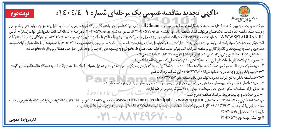 شرکت مدیریت تولید برق نکا در نظر دارد نسبت به خرید گلوله های اسفنجی سیستم Ball Cleaning تپ روژ کندانسورهای واحد بخار نیروگاه شهید سلیمی طبق شرایط ذیل و همچنین شرایط فنی و خصوصی پیوست اسناد مناقصه اقدام نماید. علاقه مندان میتوانند اسناد مناقصه را از روز یکشنبه مورخه 1404.05.19 لغایت روز سه شنبه مورخه 1404.05.28 با مراجعه به سامانه تدارکات الکترونیکی دولت (ستاد) به آدرس ستاد ایران  با شماره 2004093791000017 دریافت نموده و پس از تکمیل استاد پاکت پیشنهادی را حداکثر تا ساعت 16 روز شنبه مورخه 1404.06.08 ضمن بارگذاری در سامانه تدارکات الکترونیکی دولت (ستاد) صرفا پاکت الف را به صورت فیزیکی به اداره تدارکات این شرکت ارسال نمایند. پیشنهادات واصله راس ساعت 8 صبح روز یکشنبه مورخه 1404.06.09 با توجه به شرایط مناقصه باز و قرائت خواهد شد. بدیهی است به پیشنهادهای فاقد بارگذاری در سامانه تدارکات الکترونیکی دولت ستاد فاقد امضاء مشروط، مخدوش و به پیشنهادهایی که بعد از موعد مقرر واصل شود مطلقا ترتیب اثر داده نخواهد شد.
