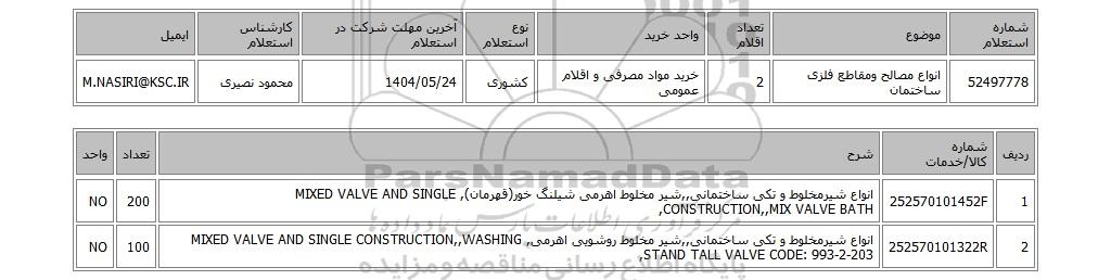 | 2 | 252570101322R | انواع شیرمخلوط و تکی ساختمانی,,شیر مخلوط روشویی اهرمی, MIXED VALVE AND SINGLE CONSTRUCTION,,WASHING STAND TALL VALVE CODE: 993-2-203, | 100 | NO |
