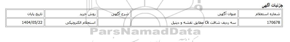 | 170678 | سه ردیف شافت Ck مطابق نقشه و دیتیل | استعلام الکترونیکی | 1404/05/22 |
