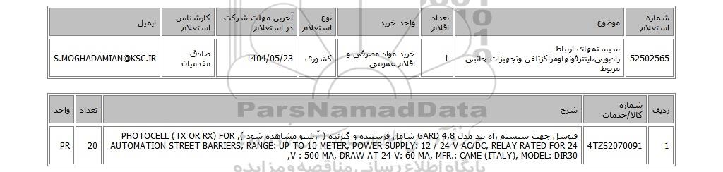 52502565سیستمهای ارتباط رادیویی،اینترفونهاومراکزتلفن وتجهیزات جانبی مربوط1خرید مواد مصرفی و اقلام عمومیکشوری1404/05/23صادق مقدمیانS.MOGHADAMIAN@KSC.IR