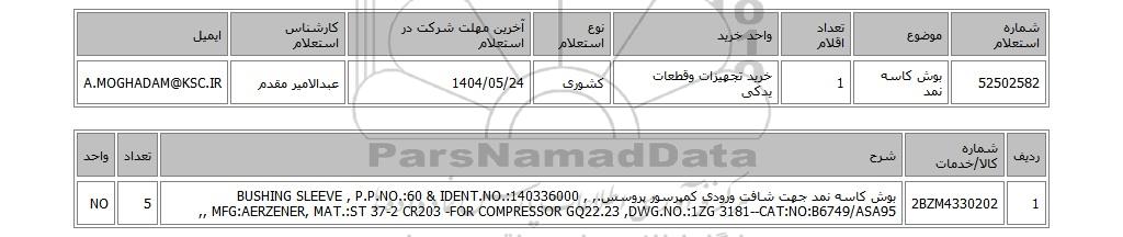 | 52502582 | بوش کاسه نمد | 1 | خرید تجهیزات وقطعات یدکی | کشوری | 1404/05/24 | عبدالامیر مقدم | A.MOGHADAM@KSC.IR |