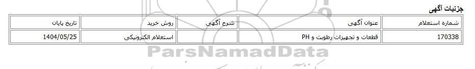 | 170338 | قطعات و تجهیزات رطوبت و PH | استعلام الکترونیکی | 1404/05/25 |