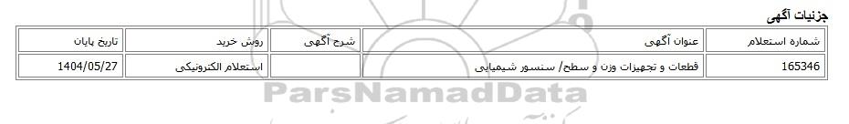 | 165346 | قطعات و تجهیزات وزن و سطح/ سنسور شیمیایی | استعلام الکترونیکی | 1404/05/27 |