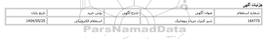 | 164775 | شیر کنترل جریان پنوماتیک | استعلام الکترونیکی | 1404/05/25 |