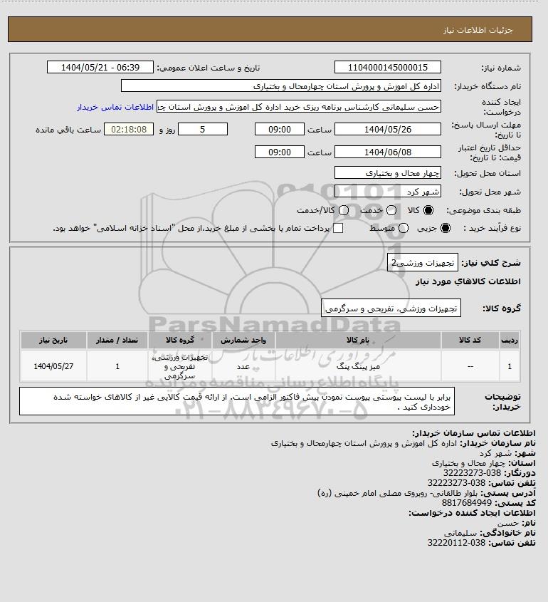 1 -- میز پینگ پنگ عدد تجهیزات ورزشی، تفریحی و سرگرمی 1 1404/05/27