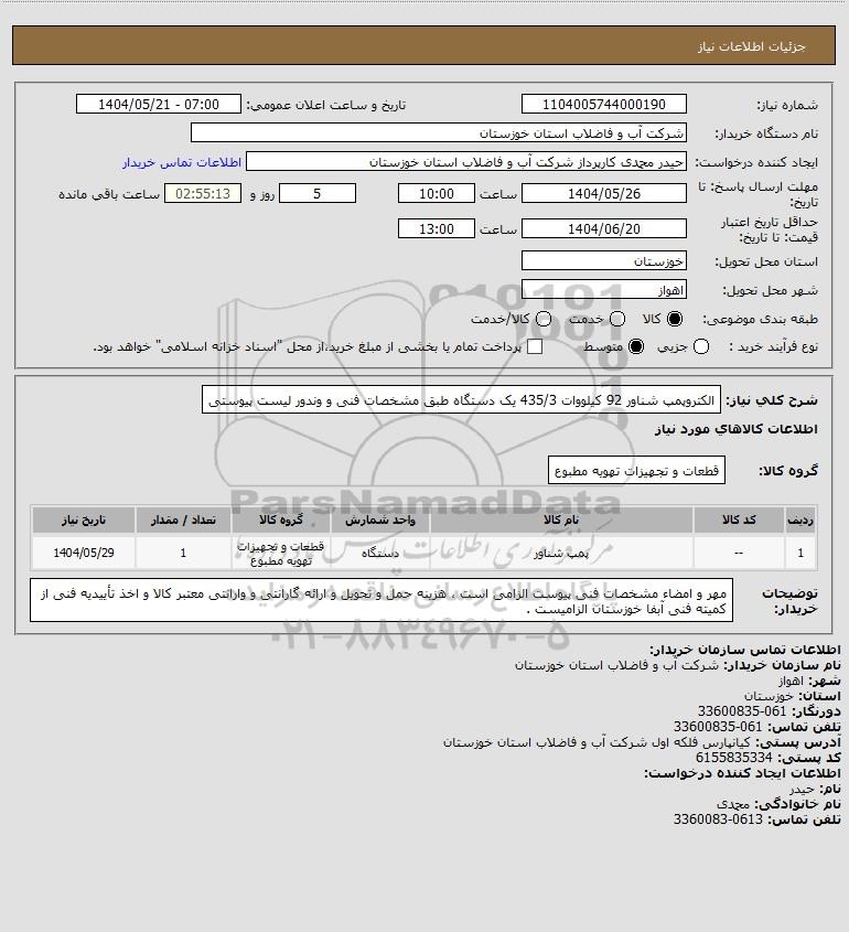 شرح کلی نیاز: الکتروپمپ شناور 92 کیلووات 435/3 یک دستگاه طبق مشخصات فنی و وندور لیست پیوستی