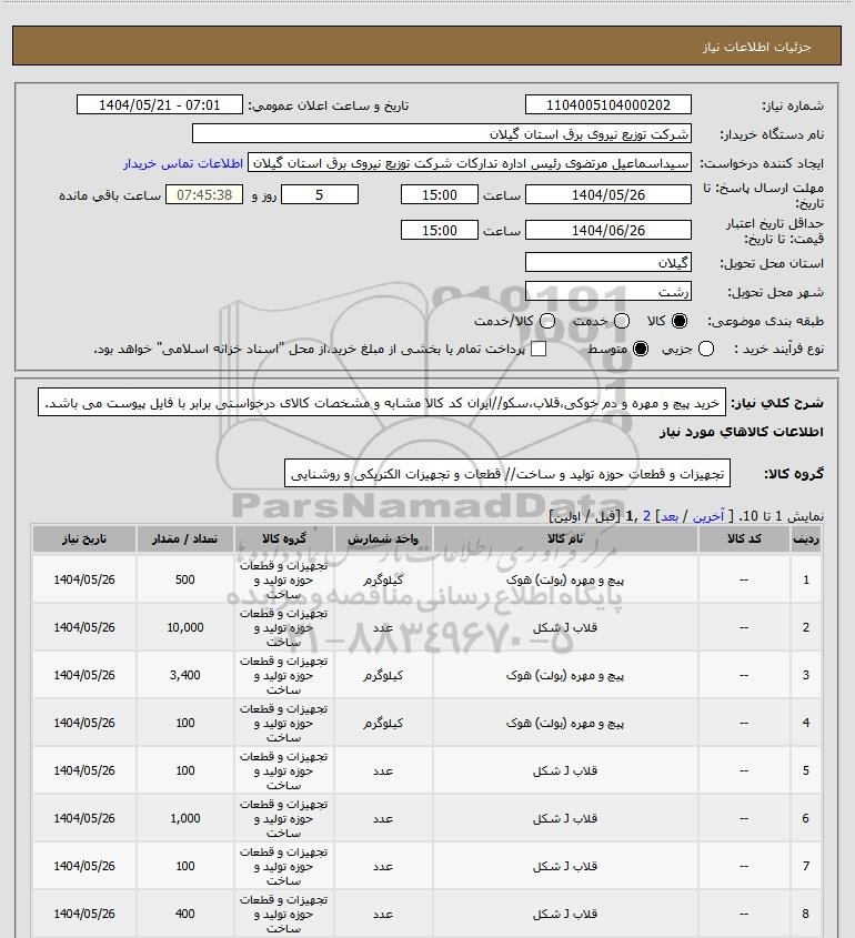 | 9 | -- | بست کمربندی | بسته | قطعات و تجهیزات الکتریکی و روشنایی | 100 | 1404/05/26 |