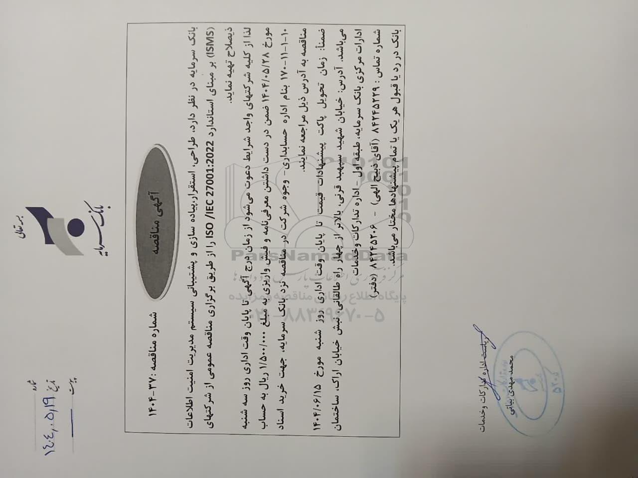 بانک سرمایه در نظر دارد، طراحی، استقرار، پیاده سازی و پشتیانی سیستم مدیریت امنیت اطلاعات (ISMS) بر مبنای استاندارد ISO/ IEC 27001:2022