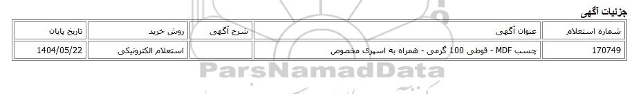 استعلام بها و موضوع استعلام استعلام الکترونیکی، چسب MDF - قوطی 100 گرمی - همراه به اسپری مخصوص به اطلاع کلیه شرکتها و افراد متخصص واجد شرایط میرساند، آگهی گذار در نظر دارد از طریق استعلام بها، نسبت به انتخاب و دریافت پیشنهادات اقدام نماید. این استعلام با کد آگهی ثبت شده در سامانه خبرگزاری پارس نماد : 9396040 منتشر شده است. مشخصات استعلام : تاریخ شروع استعلام: 1404/05/21 آخرین مهلت ارسال پیشنهاد قیمت : 1404/05/22 و محل اجرای پروژه : استان خراسان رضوی میباشد. استعلام قیمت مورد درخواست : استعلام الکترونیکی، چسب MDF - قوطی 100 گرمی - همراه به اسپری مخصوص با دستهبندیهای تخصصی و گروه های مرتبط : صنایع رنگ،رزین و چسب, مواد شیمیایی, مواد اولیه کارخانجات, استعلام اطلاع رسانی میگردد.