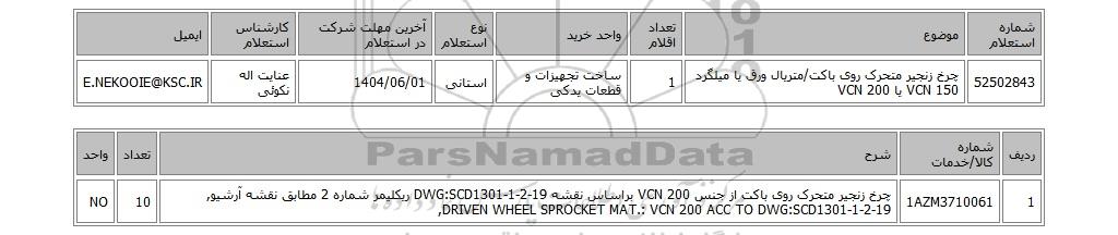 | 52502843 | چرخ زنجیر متحرک روی باکت/متریال ورق یا میلگرد VCN 150 یا VCN 200 | 1 | ساخت تجهیزات و قطعات یدکی | استانی | 1404/06/01 | عنایت اله نکوئی | E.NEKOOIE@KSC.IR |